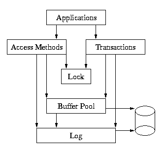 In this model, the application makes calls to the access methods and to the Transaction subsystem. The access methods and Transaction subsystems in turn make calls into the Memory Pool, Locking and Logging subsystems on behalf of the application.