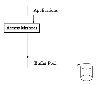 As you can see from this diagram, the application makes calls into the access methods, and the access methods use the underlying shared memory buffer cache to hold recently used file pages in main memory.