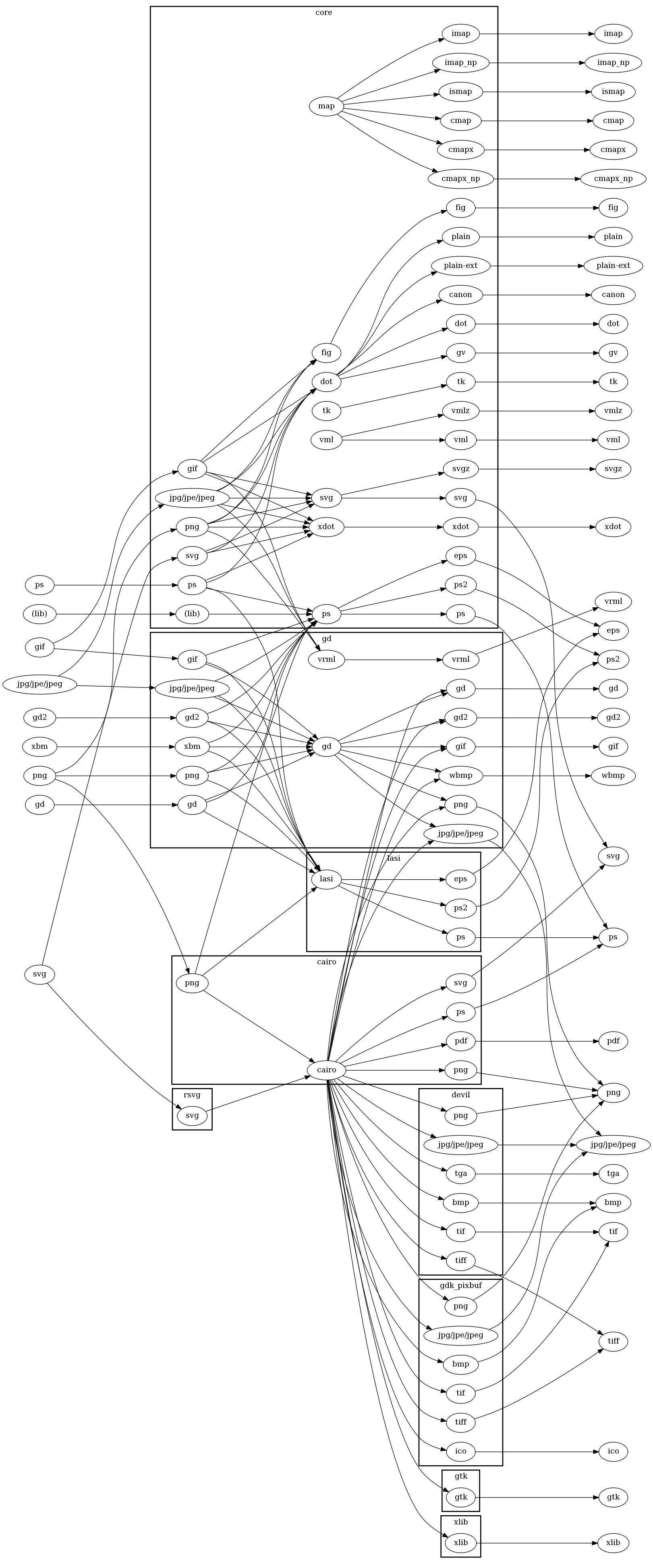 The graph below shows what image formats can be used in which output formats, and the required plugins. On the left are the supported image formats. On the right are the supported output formats. In the middle are the plugins: image loaders, renderers, drivers, arranged by plugin library. This presents the most general case. A given installation may not provide one of the plugins, in which case, that transformation is not possible.