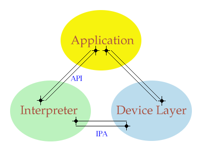 The figure below illustrates the tripartite division of application, interpreter, and device layer. The internal workings of each of the three is irrelevant; all that matters is the three interfaces which are separate. The core of libwmf is the interpreter, and as such only the interfaces between (a) the interpreter and the application - the API - and (b) the interpreter and the device layer - the IPA - are defined. Applications that wish to implement their own new device layer are free therefore to define whatever interface is suitable.
