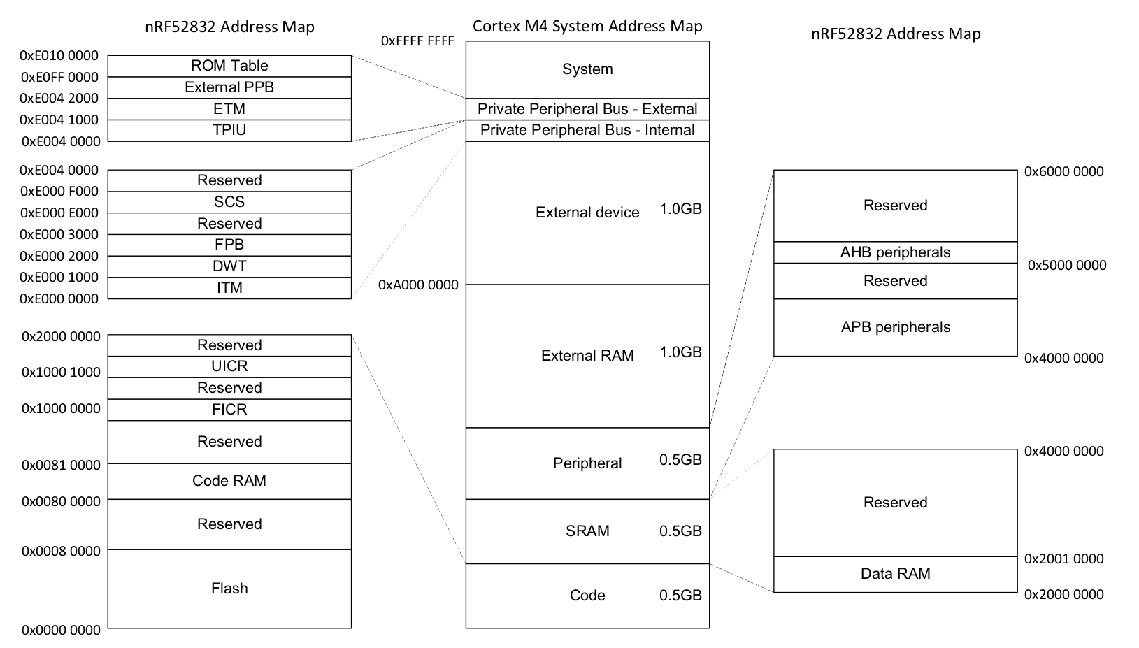 Although 32 bit microcontrollers have a real and linear address space from 0x0000_0000, and 0xFFFF_FFFF, they generally only use a few hundred kilobytes of that range for actual memory. This leaves a significant amount of address space remaining. In earlier chapters, we were talking about RAM being located at address 0x2000_0000. If our RAM was 64 KiB long (i.e. with a maximum address of 0xFFFF) then addresses 0x2000_0000 to 0x2000_FFFF would correspond to our RAM. When we write to a variable which lives at address 0x2000_1234, what happens internally is that some logic detects the upper portion of the address (0x2000 in this example) and then activates the RAM so that it can act upon the lower portion of the address (0x1234 in this case). On a Cortex-M we also have our Flash ROM mapped in at address 0x0000_0000 up to, say, address 0x0007_FFFF (if we have a 512 KiB Flash ROM). Rather than ignore all remaining space between these two regions, Microcontroller designers instead mapped the interface for peripherals in certain memory locations. This ends up looking something like this: