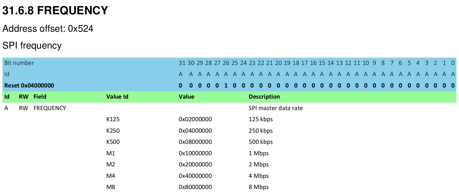 Configuration of these peripherals works similarly. Instead of calling a function to configure a peripheral, a chunk of memory is exposed which serves as the hardware API. Write 0x8000_0000 to a SPI Frequency Configuration Register, and the SPI port will send data at 8 Megabits per second. Write 0x0200_0000 to the same address, and the SPI port will send data at 125 Kilobits per second. These configuration registers look a little bit like this: